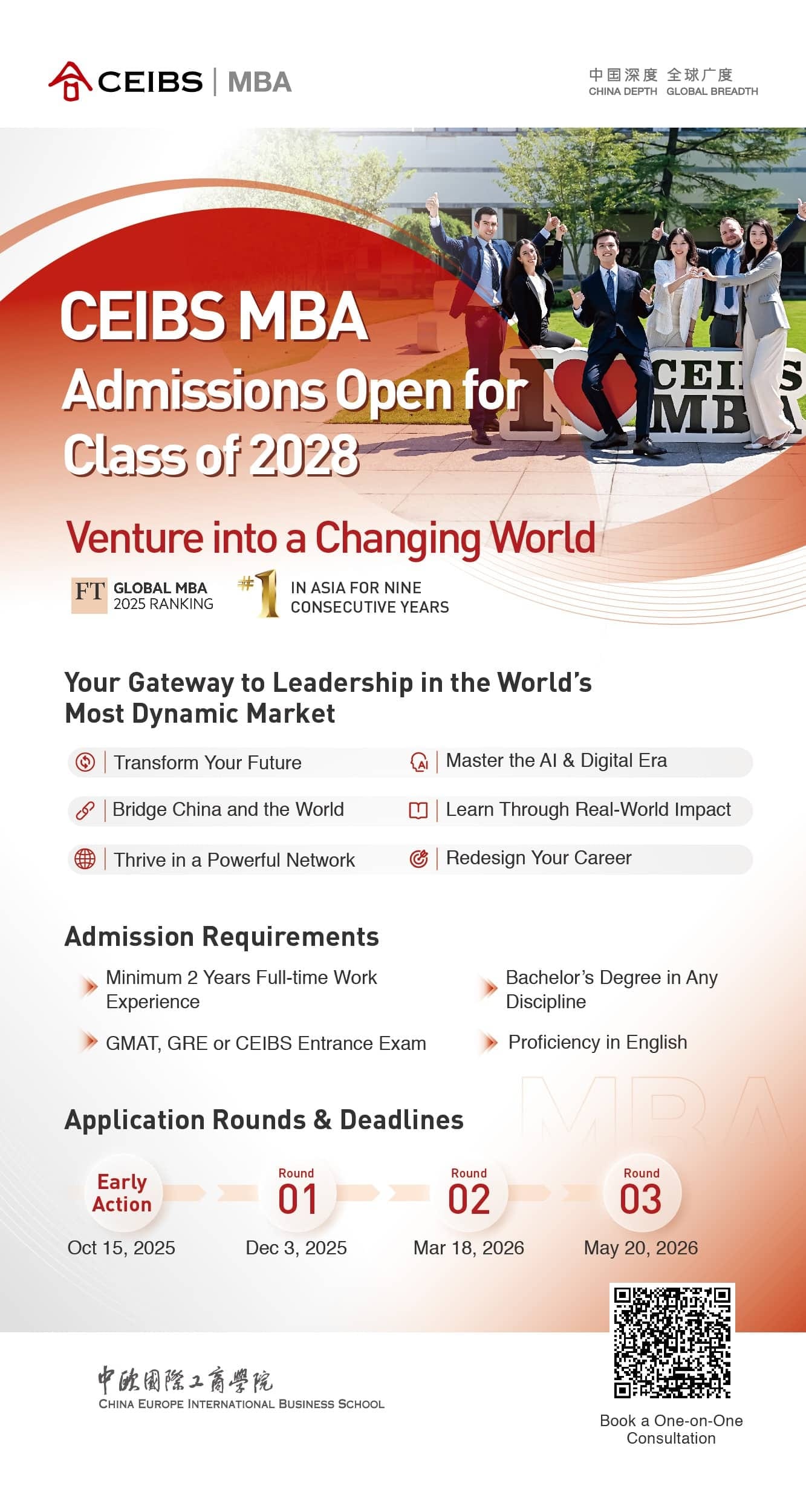 Admissions for the CEIBS MBA 2026 intake are now open. Download or scan the 2026 MBA brochure below.